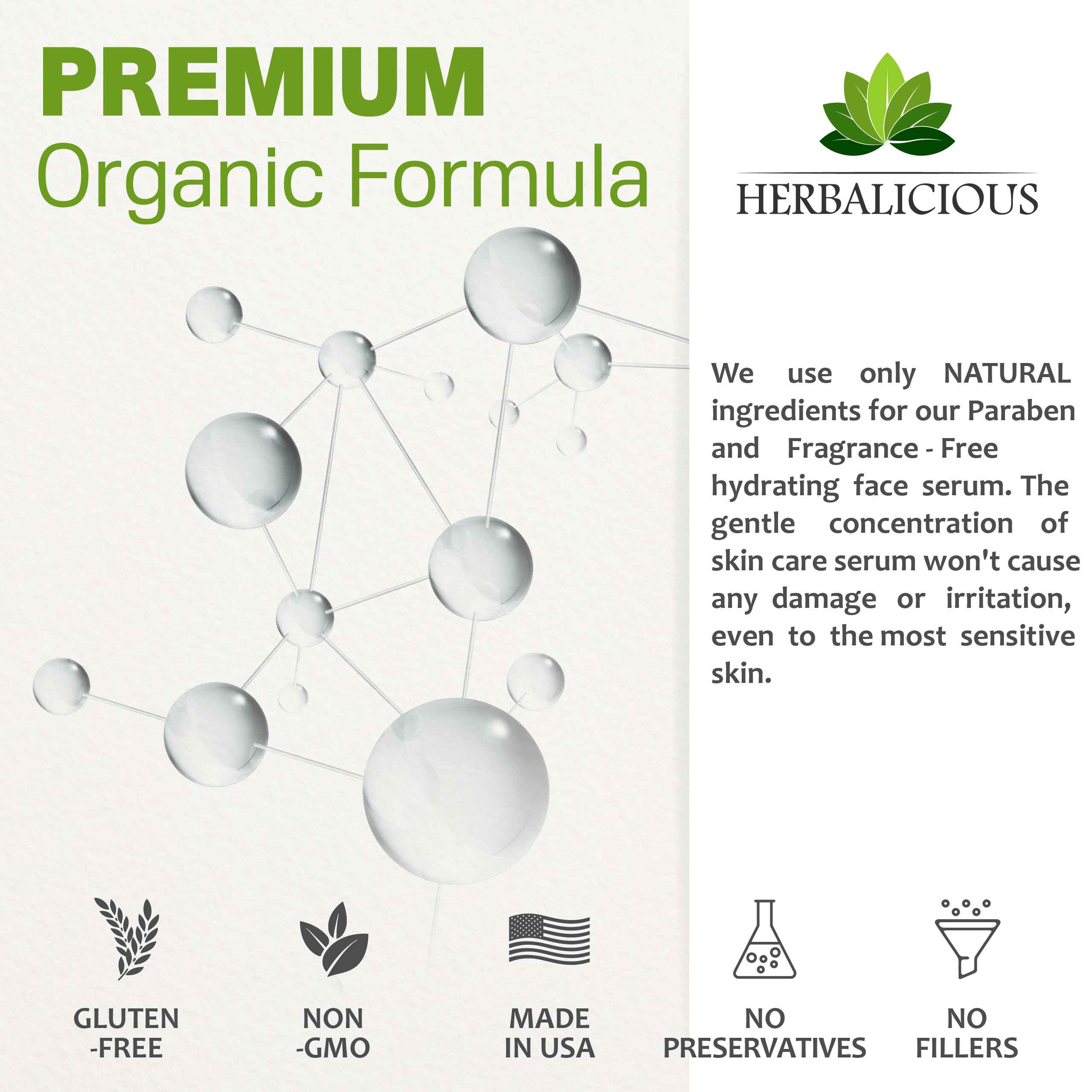 - Premium Organic Formula: What makes the Herbalicious hydrating hyaluronic acid serum truly unique is the premium formulation with pure organic HA and no artificial fragrances and dyes, parabens or sulfates! This serum is also 100% vegan and not tested on animals.